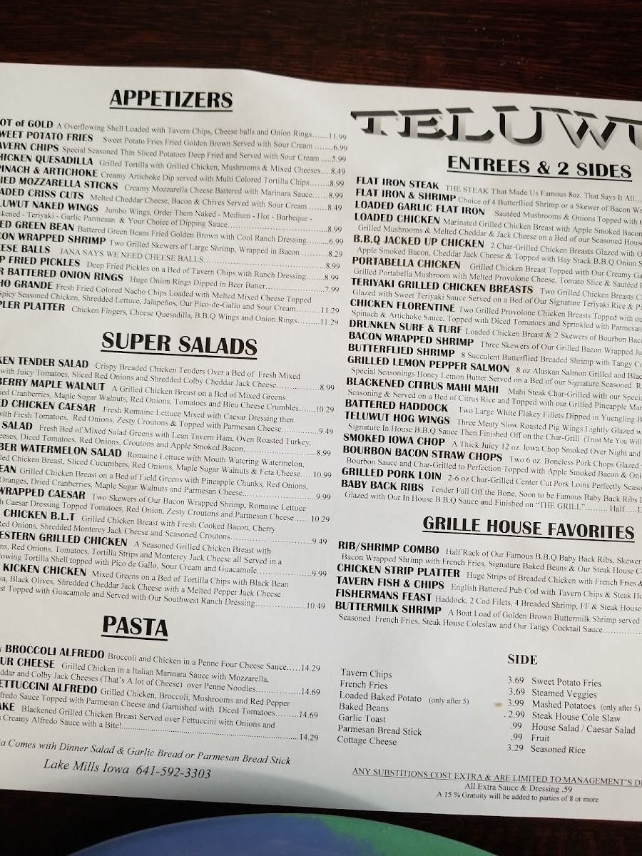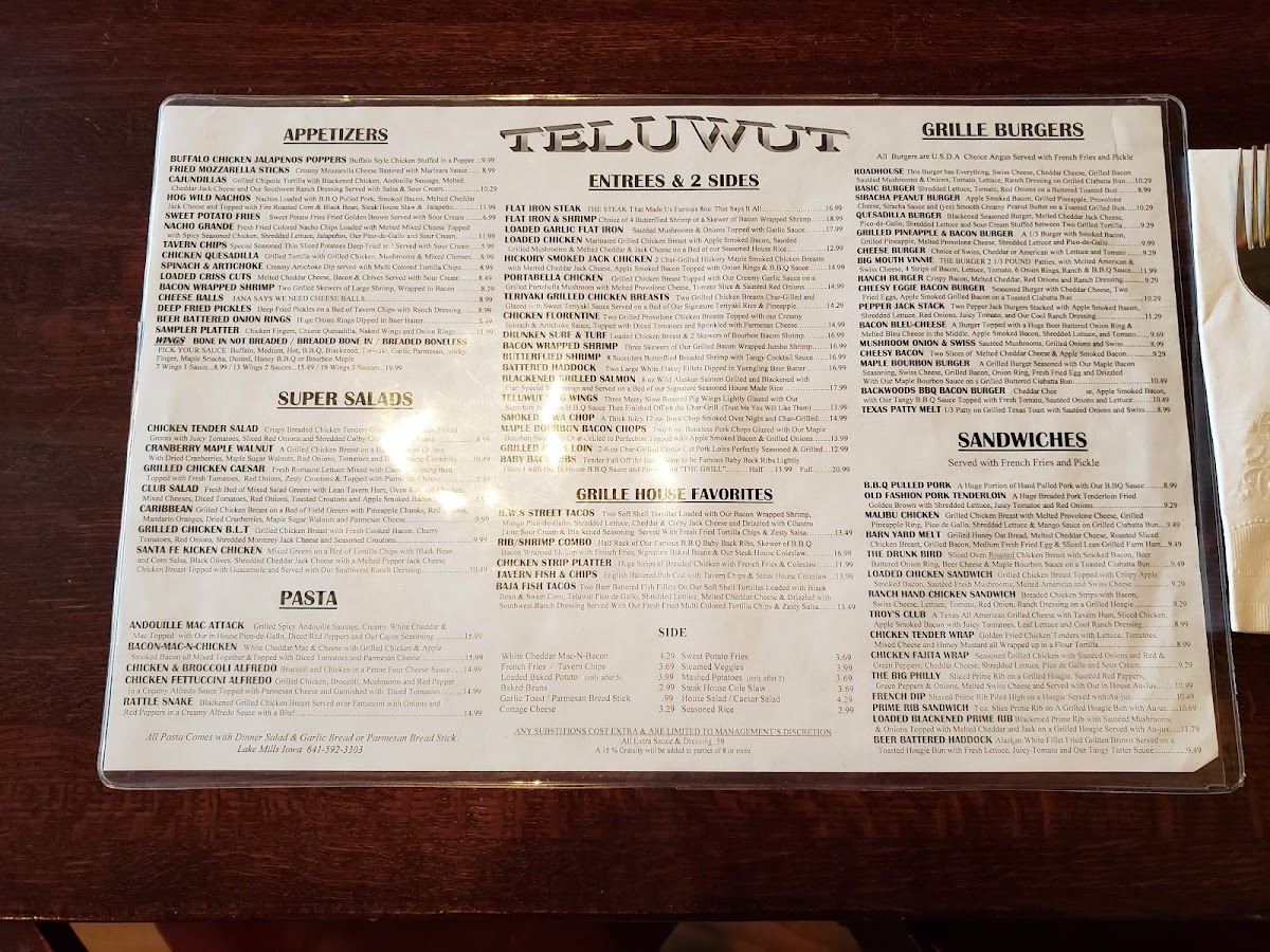 Welcome to Teluwut Grille House & Pub, where culinary delight meets rich history. Nestled in an old bank building at 224 W Main St, Lake Mills, IA, this unique restaurant offers a hearty menu that guarantees satisfaction. The ambiance is captivating, with a stunning antique bar and vintage decor, making every visit special.